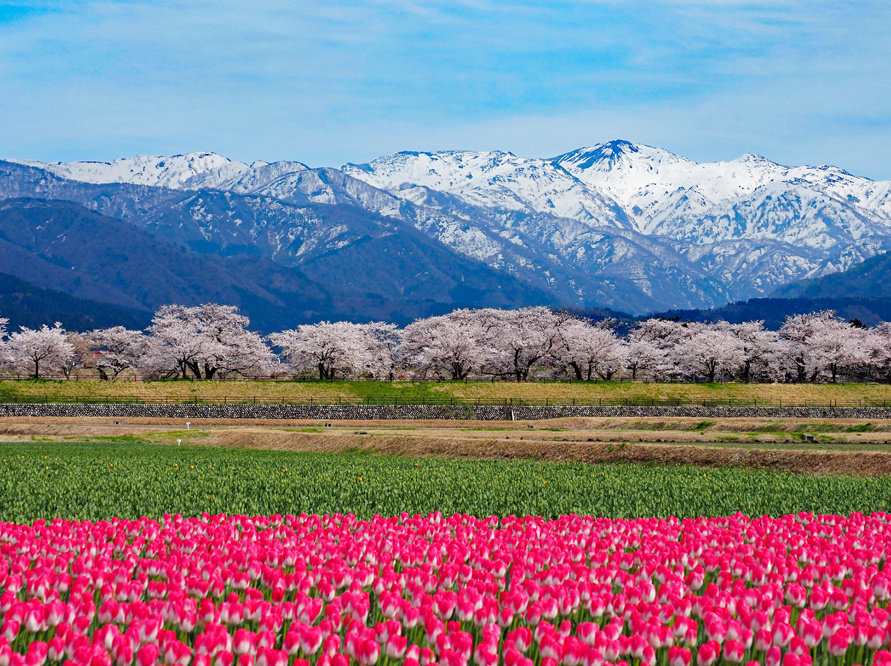 でも背景に雪が残ってる北アルプス、前面に桜はチューリップ、最高でした